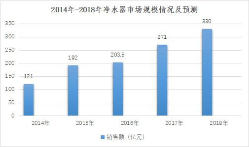 我國凈水器市場尚未完全開發(fā),目前我國凈水器市場覆蓋率僅5%,而韓國的市場覆蓋率高達(dá)95%。這其中,蘊(yùn)含著巨大的商機(jī),未來凈水器市場可以發(fā)展成上千億乃至更多的產(chǎn)業(yè)。根據(jù)中商產(chǎn)業(yè)研究院發(fā)布的《2018-2023年中國凈水器市場前景及投資機(jī)會(huì)研究報(bào)告》數(shù)據(jù)顯示,2016年中國凈水器銷售規(guī)模為203.5億元,同比增長40.6%;2017年中國凈水器市場規(guī)模達(dá)271億元,同比增長33.2%,其中線上可達(dá)213億元,線下可達(dá)58億元。同時(shí),在2018年中國凈水器銷售規(guī)?;?qū)⑼黄?30億元。